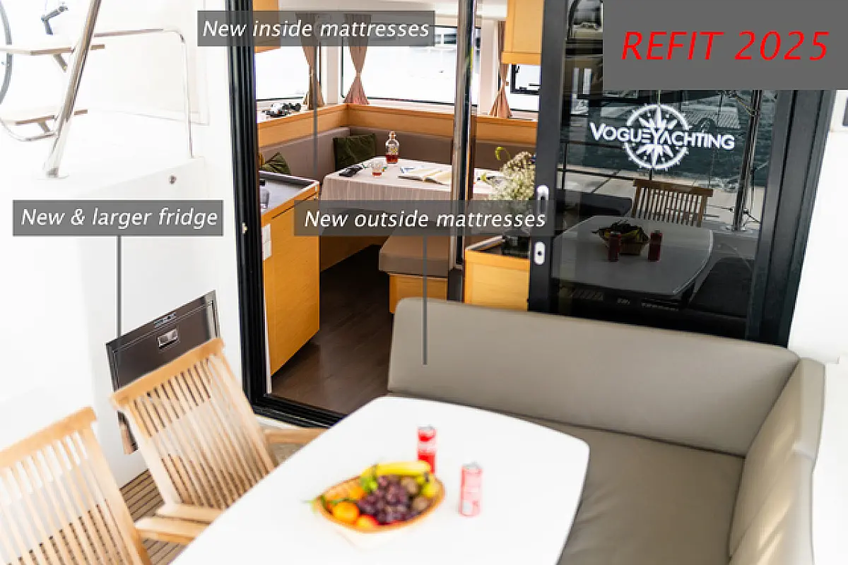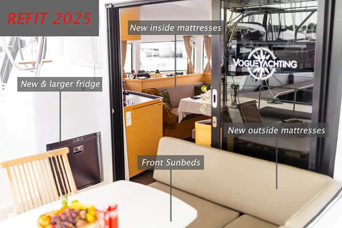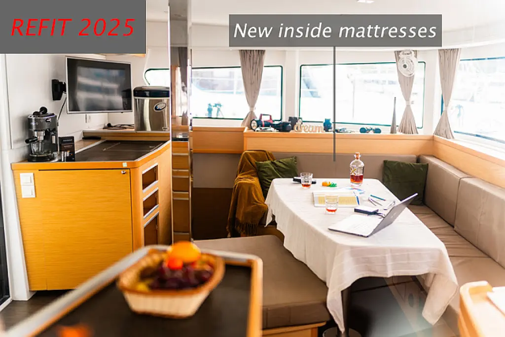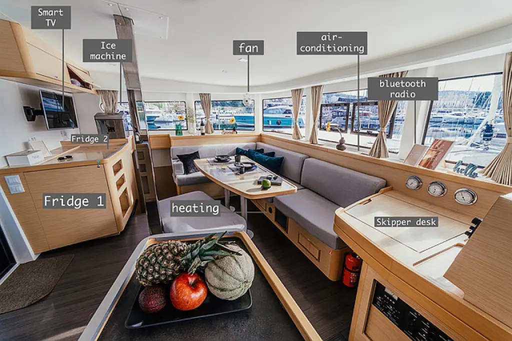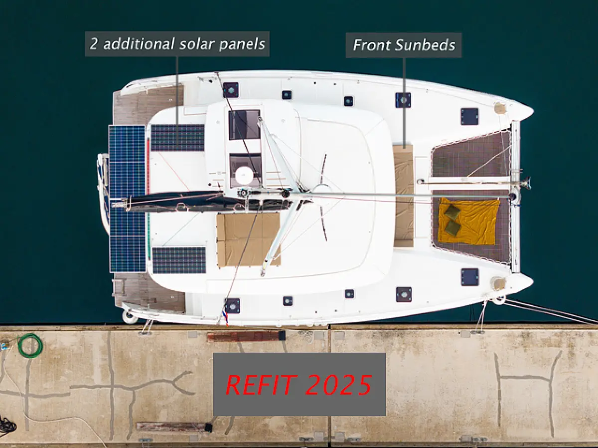 Air condition , Coffee maker , Cockpit cushions , Dinghy , Electric winches , Electric toilet , Ice maker , Holding tank , Inverter , Bimini , Solar Panels , Sprayhood , Teak Cockpit , Heating