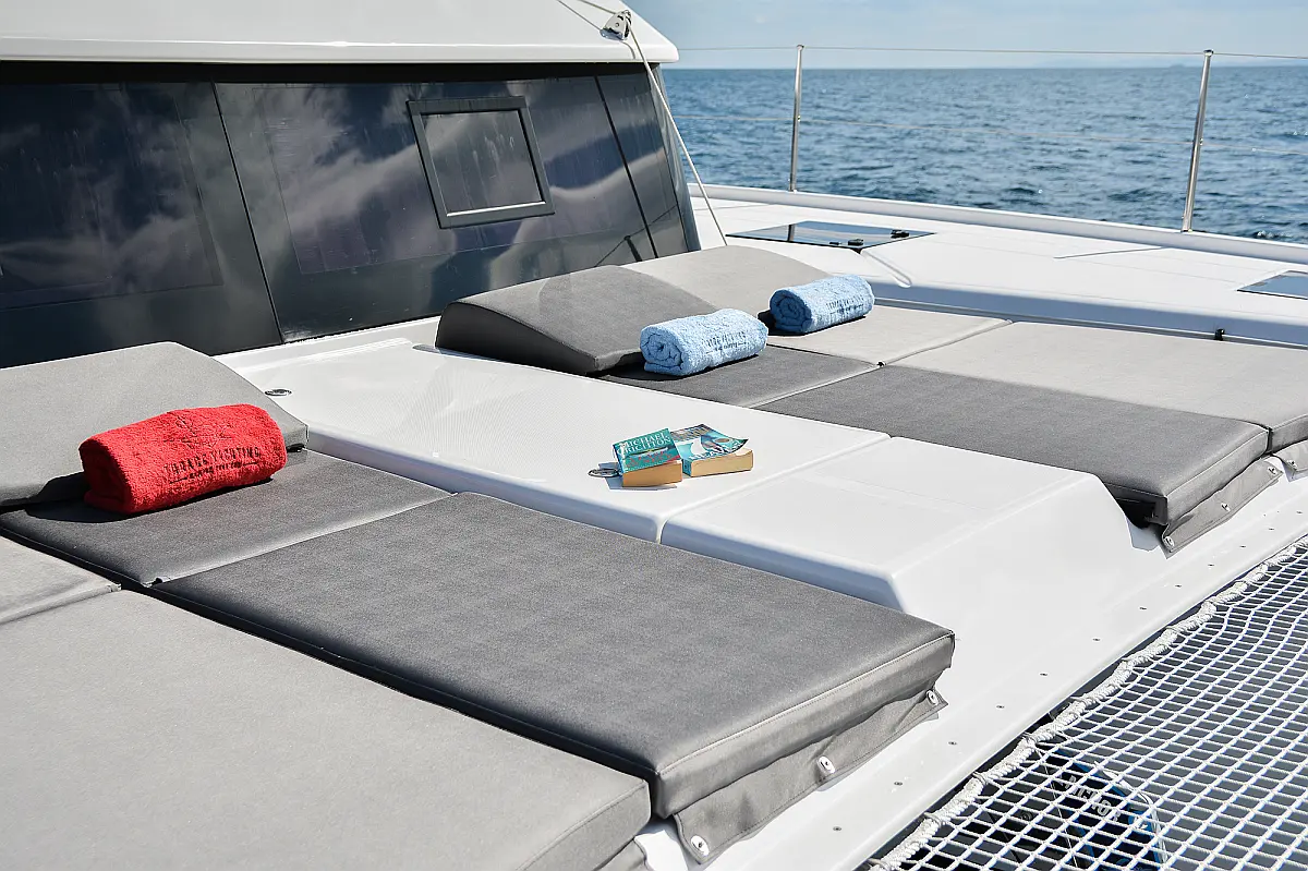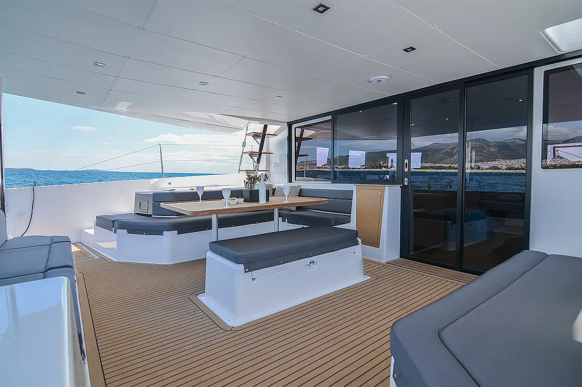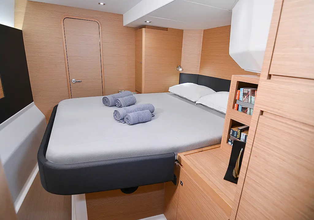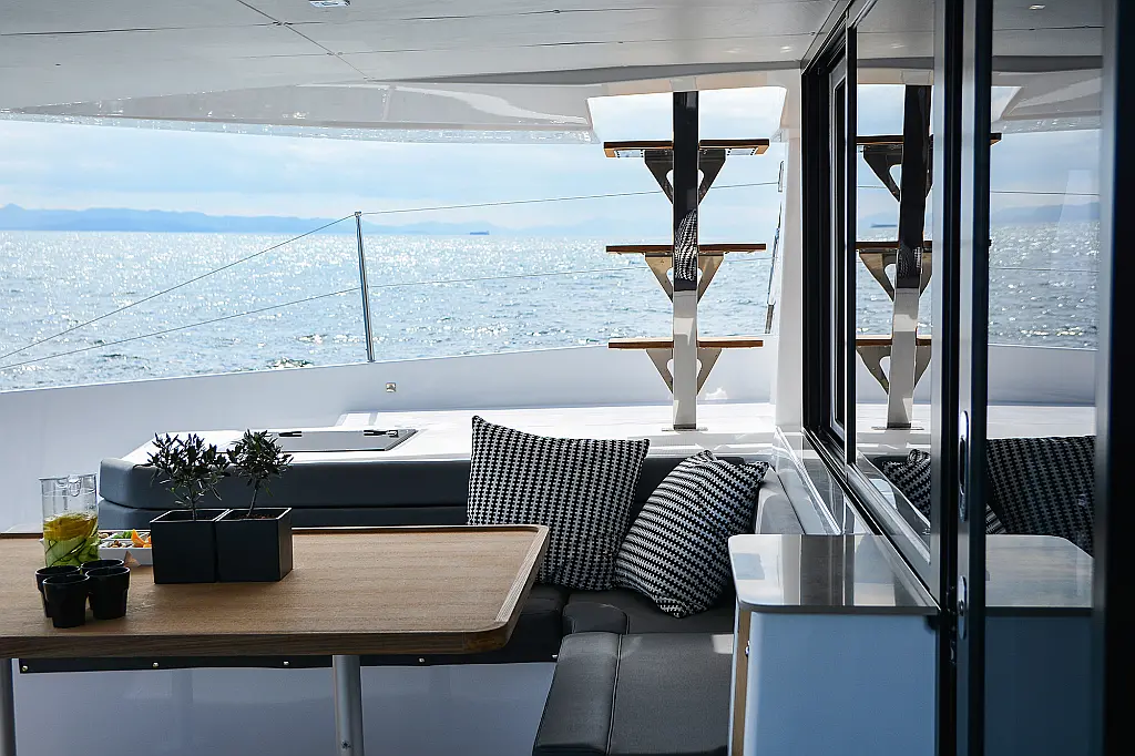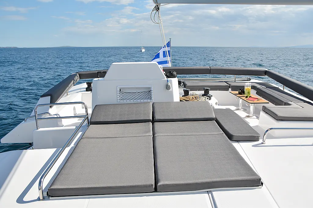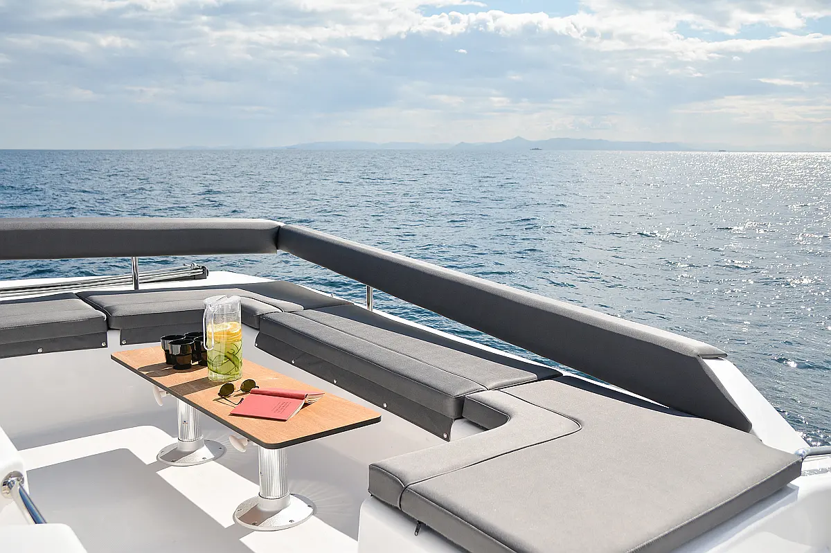 Флайбридж , Гриль в кокпите , Холодильник , Кофеварка , Генератор , Опреснитель морской воды , Инвертор , Бимини , Подвесной мотор , Динги , Кондиционер , Подушки в кокпите , Динамики в кокпите , Тиковый кокпит , Wi-Fi и Интернет