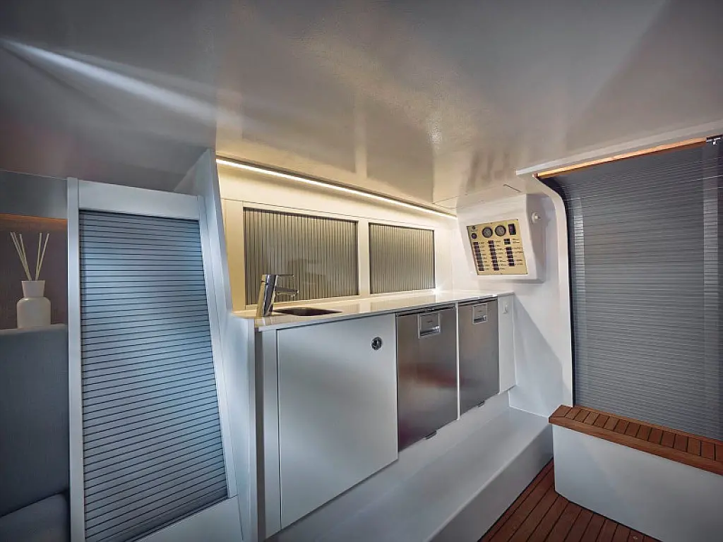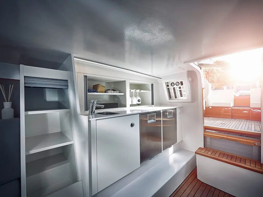 Тиковая палуба , Спрейхуд , Бимини , Тиковый кокпит , Плавательная платформа , Холодильник , Wi-Fi и Интернет , Динамики в кокпите