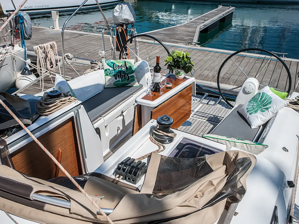 Teak Cockpit , Sprayhood , Bimini , Cockpit cushions , Outboard engine , Cockpit speakers , Heating